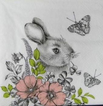 DESCRIERE VIZUALĂ: Colorat, dar în același timp abstract, cu un iepure, 2 flori roz, fluturi și câteva plante decorative.