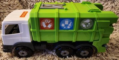 DESCRIERE VIZUALĂ:mașină de gunoi,6 roți,compartimente pentrureciclarea gunoaielor, spate detașabil pentru accesarea compartimentului de gunoi