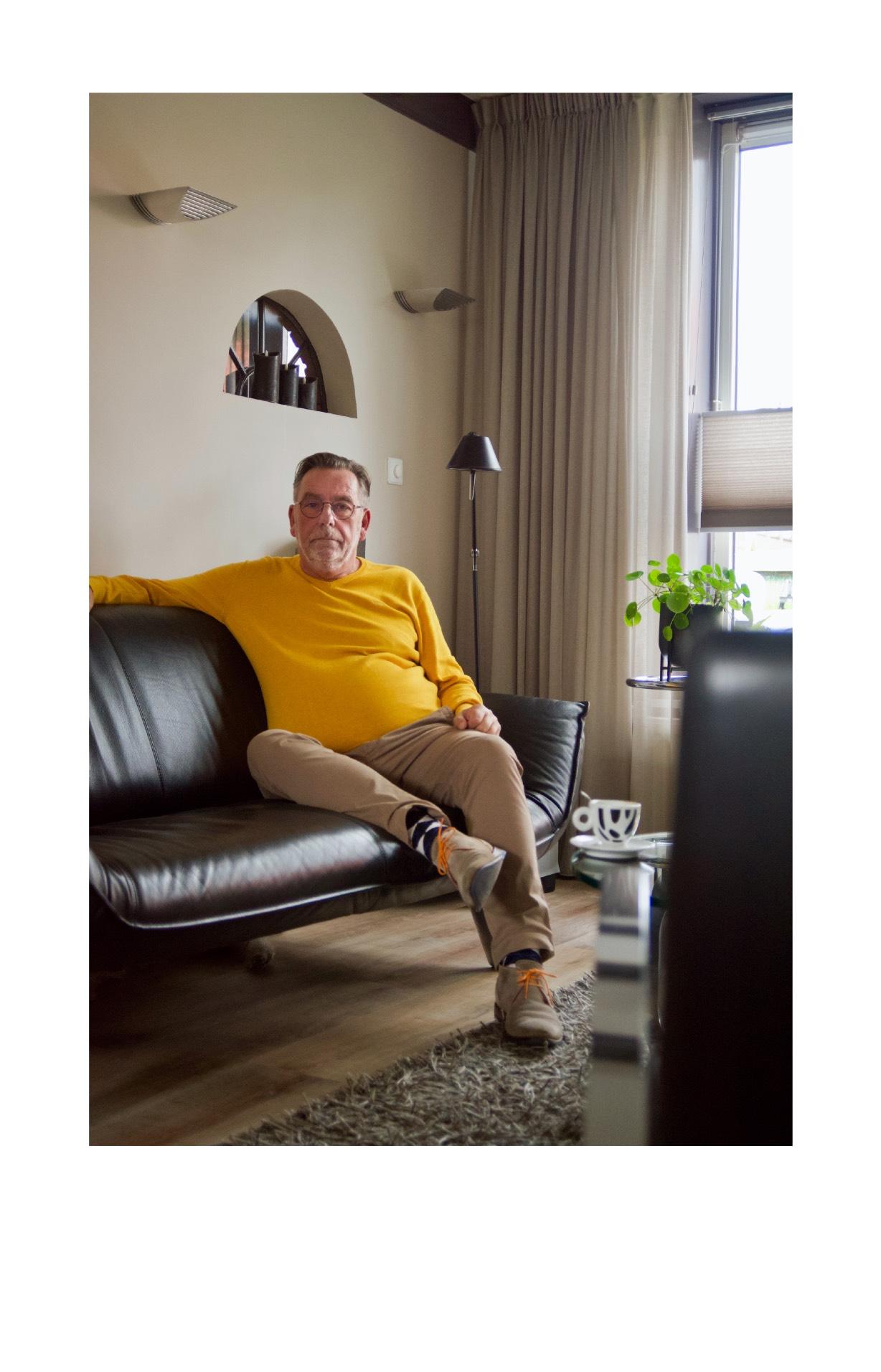 Voor mijn eerste portret op locatie was ik in tuindorp Oostzaan bij Kees Geers. Kees woont in een tuindorp en dus klein dacht ik, maar dat bleek niet het geval. Ik ben met tussenposen drie keer bij Kees geweest om een goed portret voor de expositie te maken. Bij de eerste afspraak had ik een groothoek zoomlens met flitser meegenomen, maar vanwege mijn foutieve inschatting van de grootte van het huis, is het me niet gelukt om goede foto’s te maken. De tweede keer had ik naast de zoomlens ook mijn lichtsterke 50 mm lens meegenomen, waardoor de foto’s weliswaar beter lukten, maar niet optimaal waren. Op advies van Caro en met instemming van Kees om nog een derde poging te wagen, ben ik op 11 september nog een derde keer langs gegaan. Ik had nu beide lenzen plus een analoge zoomlens met polarisatiefilter en het statief van Kees ter beschikking. Het scherpstellen en het instellen van de juiste belichting van de camera op het statief, bleek nog niet zo makkelijk. Overigens is de uitgekozen foto niet met het statief, maar met de hand genomen. Het resultaat is een scherpe foto waarbij de schittering van de bril, die ik had willen wegnemen met de polarisatiefilter, is minimaal en niet echt storend.