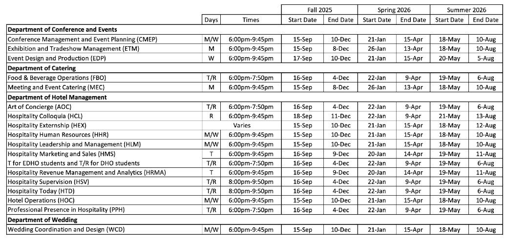 The Certificate offers a curriculum that is suitable for entry-level and mid-level hospitality managers as well as those interested in learning about this crucial job function. Course can be completed in the classroom or online within a period of 12 weeks.