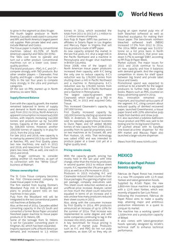 World News to grow in the segment as does Kruger. The fourth largest producer in North America, Cascades is well-sized in consumer and AfH, and North America’s largest parent roll supplier. Main private label end users include Walmart and Costco. The tissue paper is made by conventional machines (about 65-70% of North American capacity) and TADs (30-35%). The TADs cost more to operate and turn out a softer product. Conventional machines run on a lower cost, lowerquality position. The brand producers – P&G, K-C, and GP – compete strongly with TAD products. But other smaller players – Clearwater, First Quality, and Kruger – started up four new TADs in the last four years to compete more strongly in the ultra and premium categories. Of the last 10 PMs started up in North America, six were TADs. Supply/Demand Balance Even with the capacity growth, the market remained balanced in terms of supply and demand in North America, contacts said. From 2011 to 2014, North America’s apparent consumption increased 443,000 tonnes, with imports increasing 142,000 tonnes and production up by 341,000 tonnes. Capacity at the same time rose by 306,000 tonnes. However, another 200,000 tonnes of capacity is in play for 2015, from the 2014 total. For late 2015 and 2016, new capacity is to startup by yearend 2015 by von Drehle at Natchez, MS, and First Quality plans two new machines, one each in 2015 and 2016, and newcomer St. Croix Tissue plans two news PMs as well, one each in 2015 and 2016. Also, Kruger continues to consider adding another US machines, as part of its connection with the “White Cloud” business at Walmart. Chinese ownership first The St. Croix Tissue company becomes the first Chinese-owned company to make tissue paper in the USA. The firm started from buying Domtar’s Woodland Pulp mill in Baileyville and plans to product parent rolls on two machines in two years. Pulp from the Woodland mill will be integrated to the two conventional parent roll machines at Baileyville. Also, at the end of 2014, Cascades added converting capacity in the US South and converted a former Boise Paper uncoated freesheet paper machine to tissue paper products in St. Helens, OR. Some of the tonnage from St. Helens is set for Cascades’ converting plant in Kingman, AZ, which has been expanded. Imports represent 10% of North American demand, and increased to 1.3 million TISSUE WORLD magazine September/October 2015