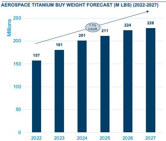 On the aftermarket side (titanium demand is partly driven by titanium replacement parts), the maintenance, repair and overhaul (MRO) market value was $211 billion in 2022 and is expected to grow to $226 billion