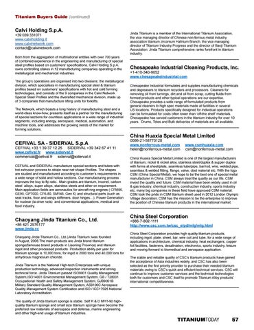 +886-7-802-1111 http://www.csc.com.tw/csc_e/pd/mlg/mlg.html China Steel Corporation provides high quality titanium products, including ingot, plate, sheet, bar, wire coil and tube, for a wide range of applications in architecture, chemical industry, heat exchangers, copper foil facilities, fasteners, desalination, electronics, sports industry, leisure and moving forward to biomedical and aerospace application. The stable and reliable quality of CSC’s titanium products have gained the acceptance of Asia industries widely, and CSC has also been selected as the first priority provider to purchase their needed titanium materials owing to CSC’s quick and efficient technical services. CSC will continue to improve customer services and the technical technologies both for customers and CSC itself to promote Titanium Alloy products’ international competitiveness.