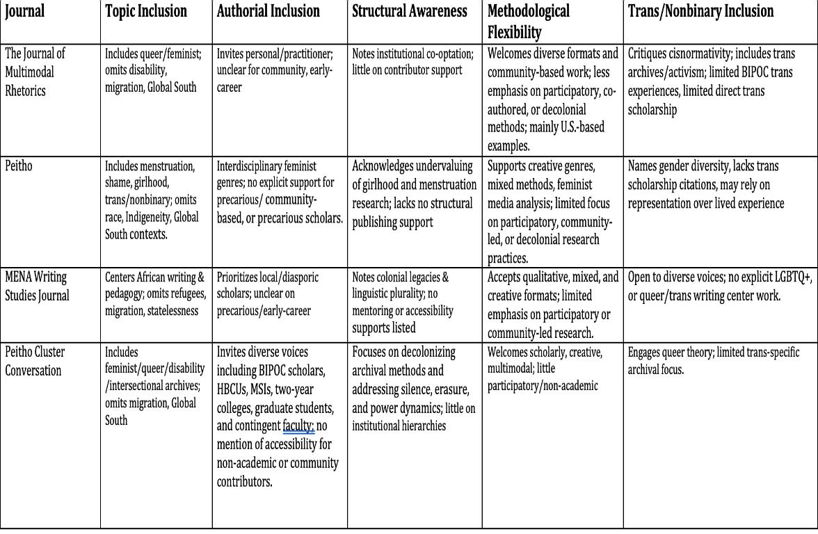 Like TPR, Writing Center Journal (WCJ) refers reviewers to the Anti-Racist Scholarly Reviewing Practices heuristic The journal also offers its own “Guidance for Reviews” document, although this guidance is less clear than TPR’ s about the purpose and role of reviewers and does not mention inclusivity, accessibility, or anti-racism explicitly. The guidance does encourage reviewers to “practice the sorts of empathy and respect for writing in progress as we would in any writing center.” WLN: A Journal of Writing Center Scholarship, Praxis: A Writing Center Journal, and SDC: A Journal of Writing Center Studies do not post guidelines for reviewers on their websites, although WLN does ascribe to the WAC Clearinghouse’s “Commitment to Diversity, Equity, Inclusion, and Justice,” which includes promoting equitable publishing practices to “encourage greater representation across cultures, backgrounds, and viewpoints.” All writing center journals also provide reviewers with the option to leave comments that only the editors will see. This practice allows reviewers to express concerns to editors that will not be shared with authors directly Some journals, including Praxis, WLN, and TPR, request that reviewers share areas of specialization within writing center studies This practice theoretically ensures that an article is appropriately matched with a reviewer who is willing to disclose particular identities, interests, or experiences. Reviewers are also encouraged to decline a review if they do not feel they know enough about an article’s subject area