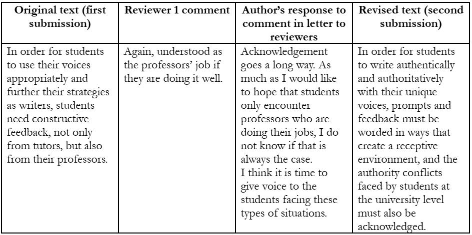 In their 2019 article “A Study of the Practices and Responsibilities of Scholarly Peer Review in Rhetoric and Composition,” for example, Lars Sutherland and Jaci Wells interviewed 20 rhetoric and composition scholars and found that they were divided in their views on the purpose of peer review Some scholars felt that reviewing should work similarly to how the field teaches writing, focusing on collaborative relationships between authors and reviewers, while others felt that reviewers should “bluntly assess the merits of the author’s text” (118) The latter, they explain, is “out of respect to the author, who deserves to know how their work is received” (118). The former view focuses on process and providing a gateway to publication; it also focuses on developing a sense of community through relational dialogue The latter view takes a product-oriented approach and frames the peer review process as a vetting, or gatekeeping mechanism. Sutherland and Wells point out that these two perspectives were articulated at the 1995 Symposium on Peer Reviewing in Scholarly Journals in Rhetoric Review and have not changed much since now three decades later (118). Within the narrower sub-field of writing center studies, divided views on peer review take on heightened significance, since a gatekeeping model is in opposition to the field’s pedagogical praxis, which focuses on writing as a process, centering the author, and non-evaluative mentorship. Since 2020, some writing center journals have taken steps to create more accessible and inclusive publishing practices, including being more explicit about guidelines and expectations for reviewers and the feedback they provide to authors For example, in their section on “Scholarly Review Practices,” The Peer Review (TPR) commits to anti-racist, accessible, and inclusive reviewing practices (“About”). The journal provides reviewers with access to the document “Anti-Racist Scholarly Reviewing Practices: A Heuristic for Editors, Reviewers, and Authors,” which offers guidance in how
