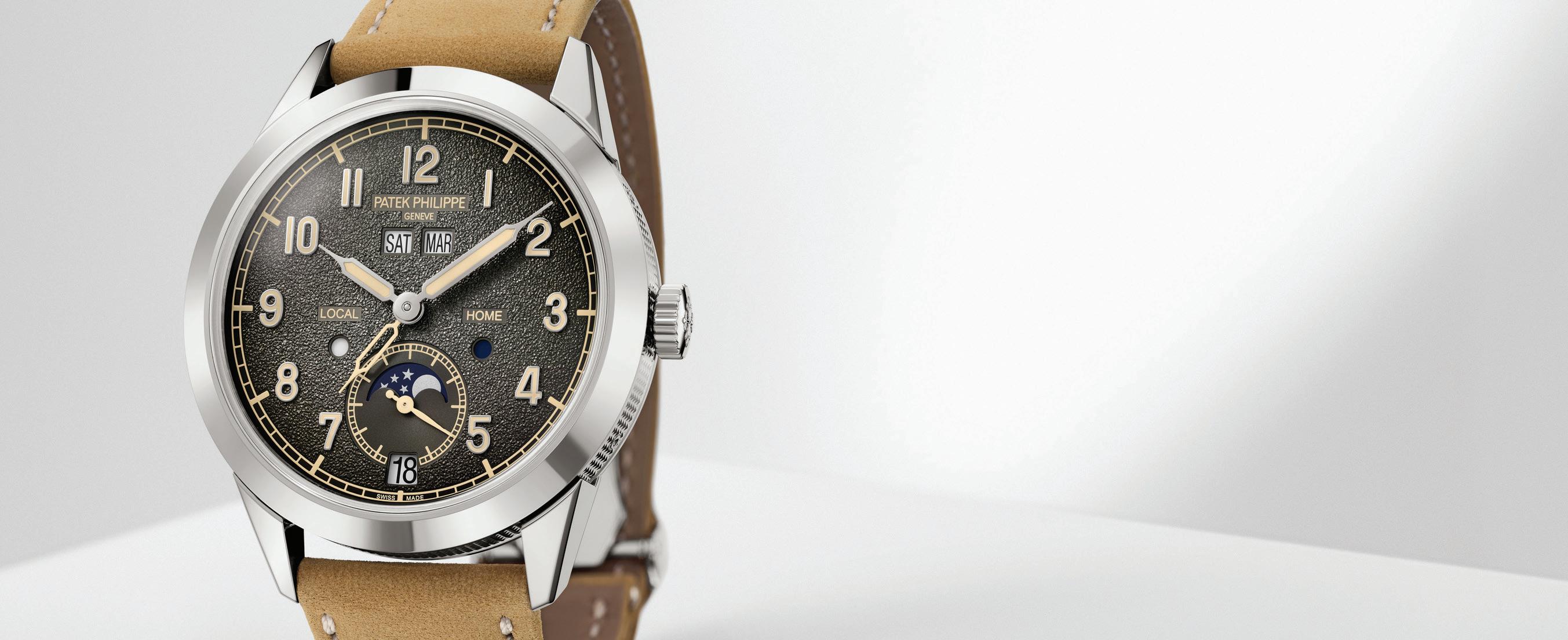 When creating its timepieces, Patek Philippe constantly leverages itself for the benefit of its customers. To package the exclusive functions in style, the manufacture created a new white-gold, 41-millimeter Calatrava case. The timeless elegance of the Calatrava design is apparent in the slightly chamfered bezel with “Clous de Paris” detailing and polished, inclined lugs. The case middle displays Patek Philippe’s signature hobnail motif along the entire circumference. The charcoal gray dial contains fine gradation to the periphery and a slightly granular structure – reminiscent of the cases of old photo cameras – a nod to getaways, wanderlust and exploration.
