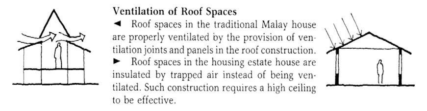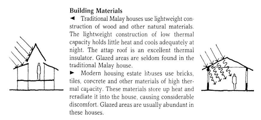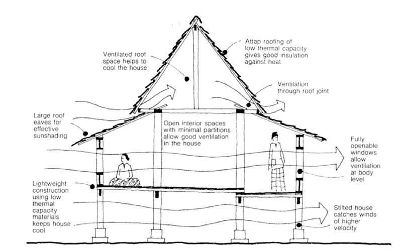 Vernacular architecture, such as the traditional dwellings of Malaysia, utilize natural ventilation, local materials and surrounding vegetation as a passive form of air conditioning.