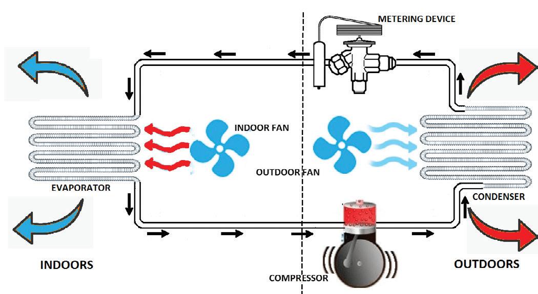 Air conditioning transfers heat from inside to outside using compressed refrigerant.