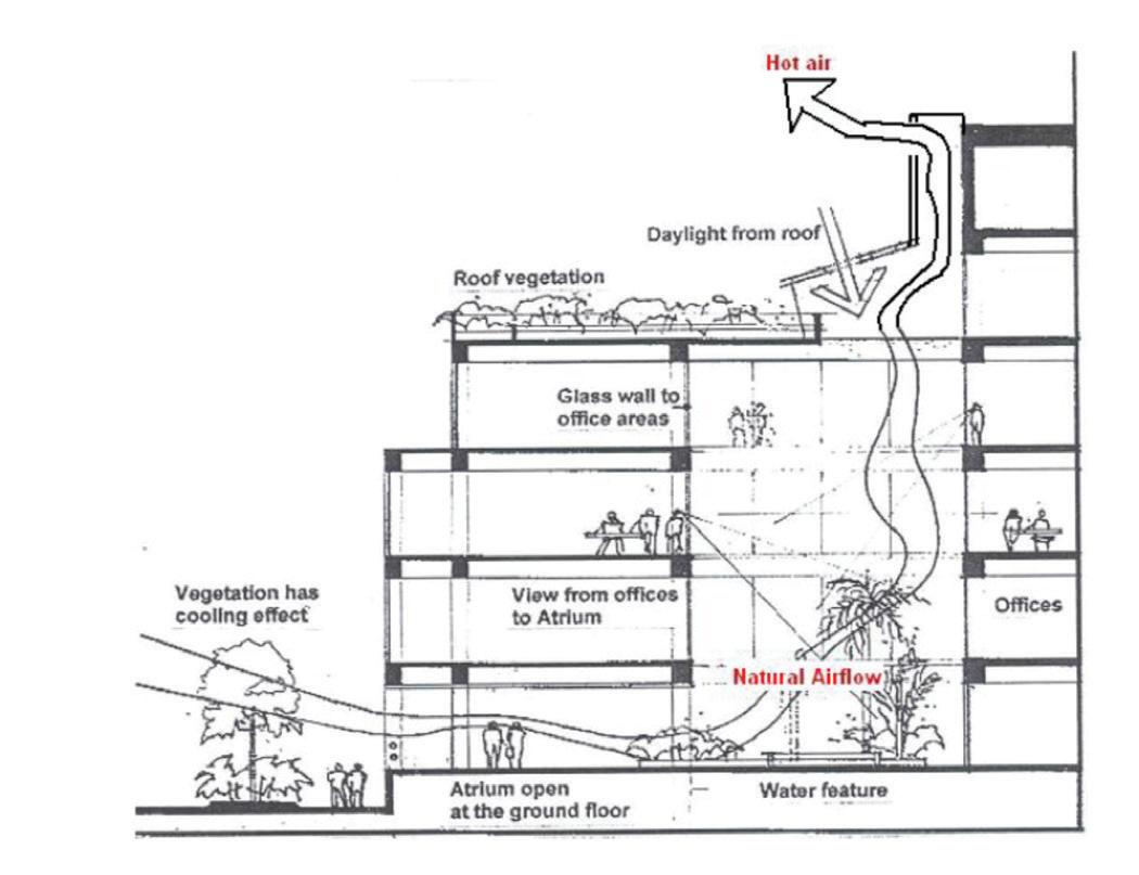 The MEGTW building was also designed with an open atrium in the center. This creates a thermal flu to funnel hot air out of the building similar to roof vents in vernacular homes.