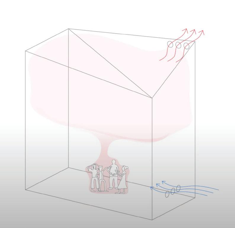 Hot air has greater thermal energy and is less dense than cold air - it naturally rises and stratifies near the ceiling. High level apertures in the roof let out hot air and bring in cooler air from below.