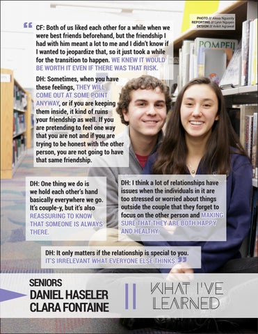 Both of us liked each other for a while when we “ CF: were best friends beforehand, but the friendship I had with him meant a lot to me and I didn’t know if I wanted to jeopardize that, so it just took a while for the transition to happen. WE KNEW IT WOULD BE WORTH IT EVEN IF THERE WAS THAT RISK. DH: Sometimes, when you have these feelings, THEY WILL COME OUT AT SOME POINT ANYWAY, or if you are keeping them inside, it kind of ruins your friendship as well. If you are pretending to feel one way that you are not and if you are trying to be honest with the other person, you are not going to have that same friendship. DH: One thing we do is we hold each other’s hand basically everywhere we go. It’s couple-y, but it’s also REASSURING TO KNOW THAT SOMEONE IS ALWAYS THERE.