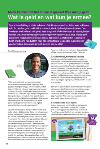 len van scholen om de lessen verder te verbeteren. Op geldlessen.nl/wijsmetjegeld kunnen scholen posters aanvragen voor in de klas. Op deze website vind je meer lesmateriaal zoals werkbladen, verdiepende materialen en tips voor financiële educatie op school. Wie de poster bestelt, ontvangt een uitnodiging om mee te denken over de verdere doorontwikkeling van de lessenserie.