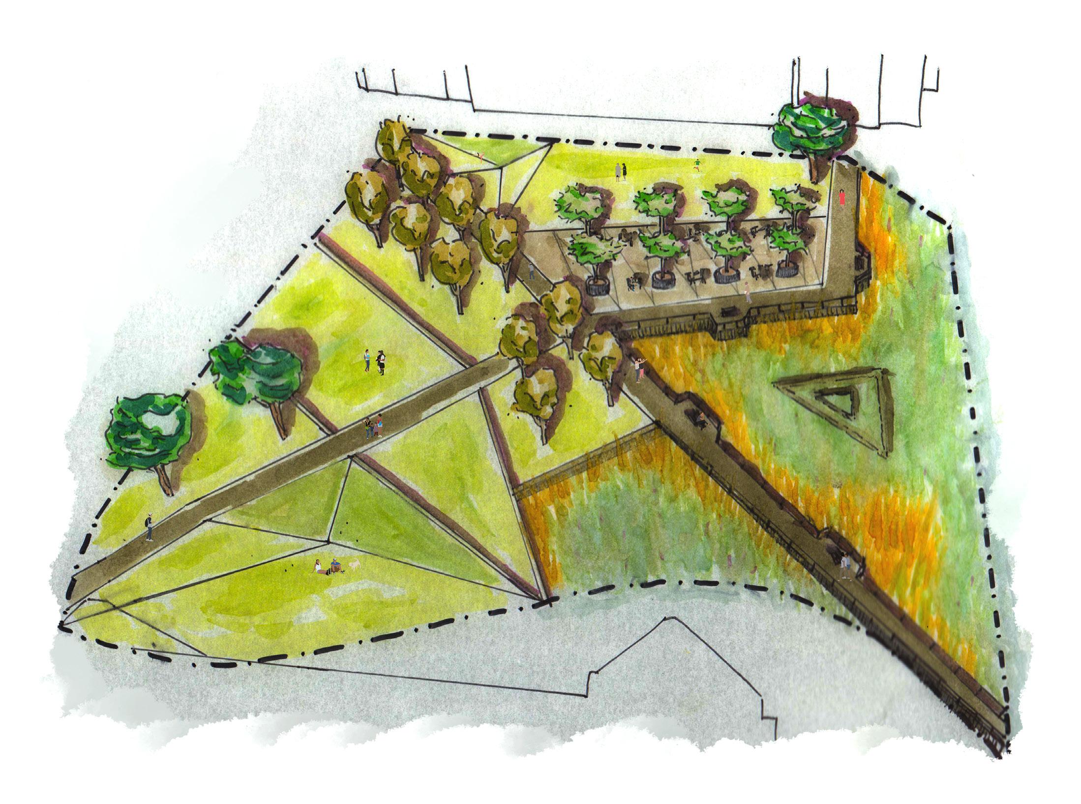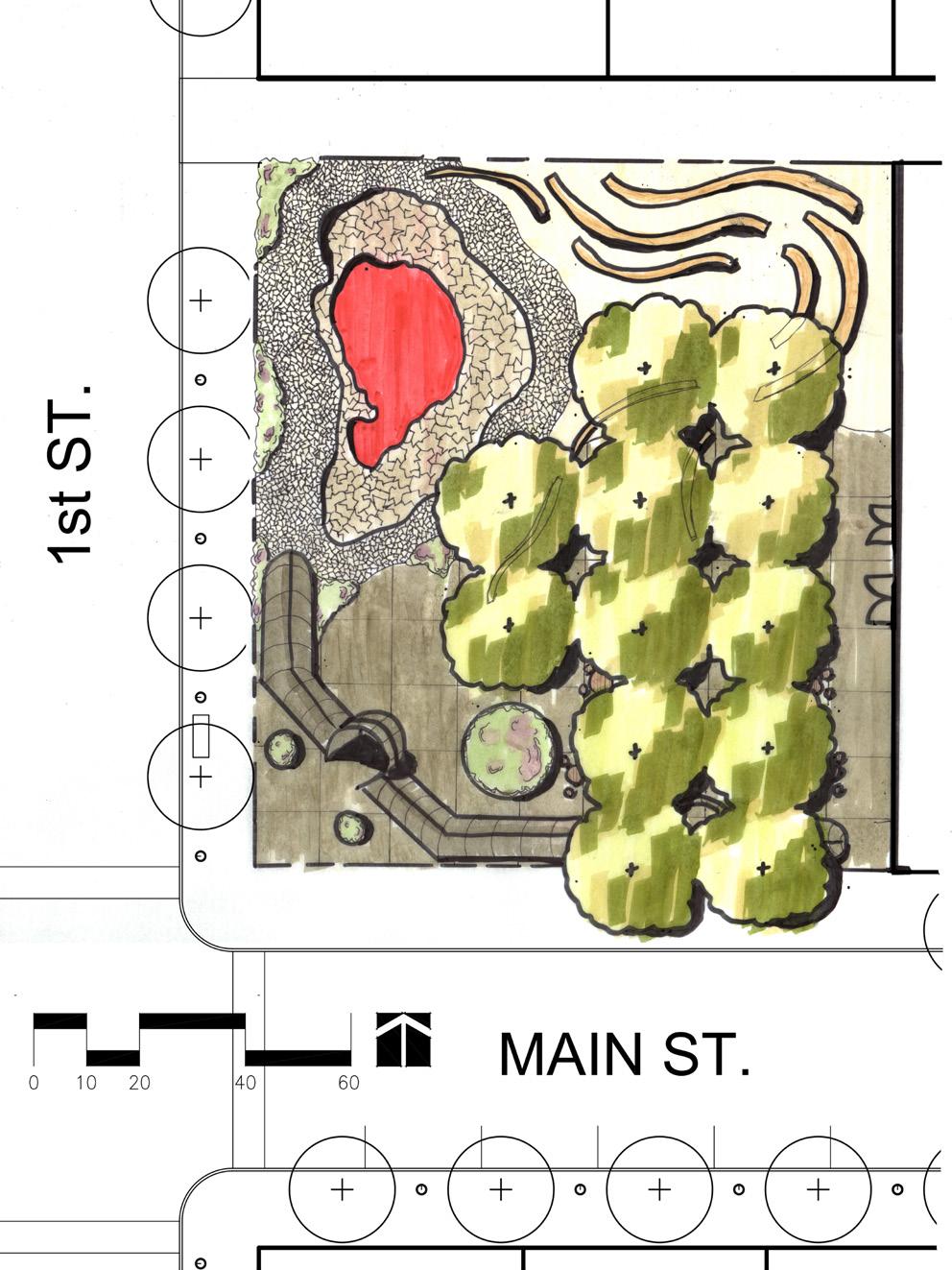 Pyramid park is a project with the constraint of creating large scale grading changes to the original site, a college campus quad. While keeping the function of the original site intact, Pyramid Park seeks to create a more interesting journey through the quad. Whether it is strolling past a rain garden on a raised walkway, moving in between pyramidal hills or up and down the terraces, or relaxing at the plaza to view an event, this park provides a place of relaxation and reflection in your journey.