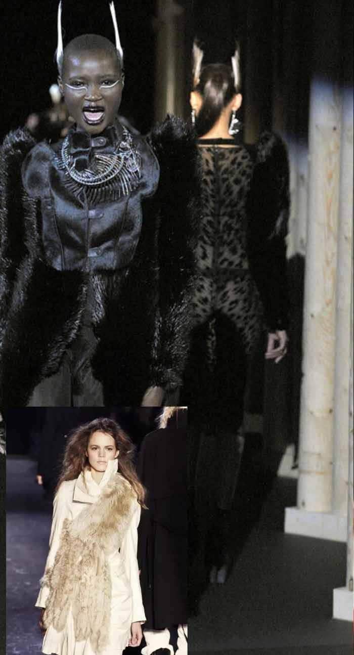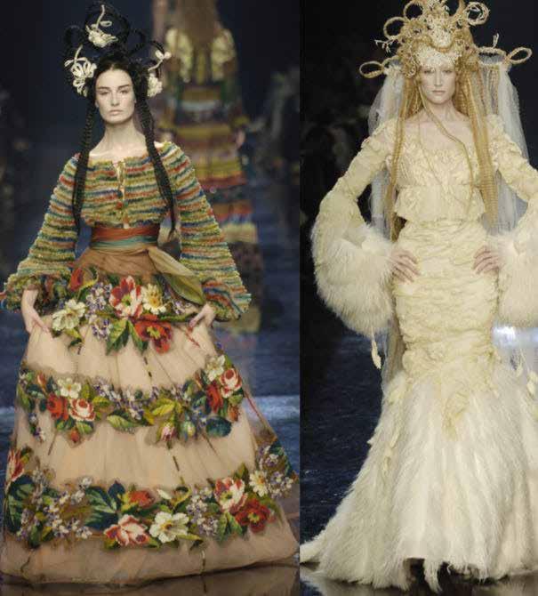 The JPG AW 05 catwalk was inspired by more Ukrainian and USSR folkloric motives (which are similar to some Balkan countries). The collection included beautiful furs but culminated with the last three final looks; Gaultier fuses eastern European embroidery, tapestry textures and almost priestess ceremonial opulence. To me this fully evokes past and ancient times, where folk lived in small villages and where townspeople, pagan priestesses and Tsarist brides all coexisted in harmony.