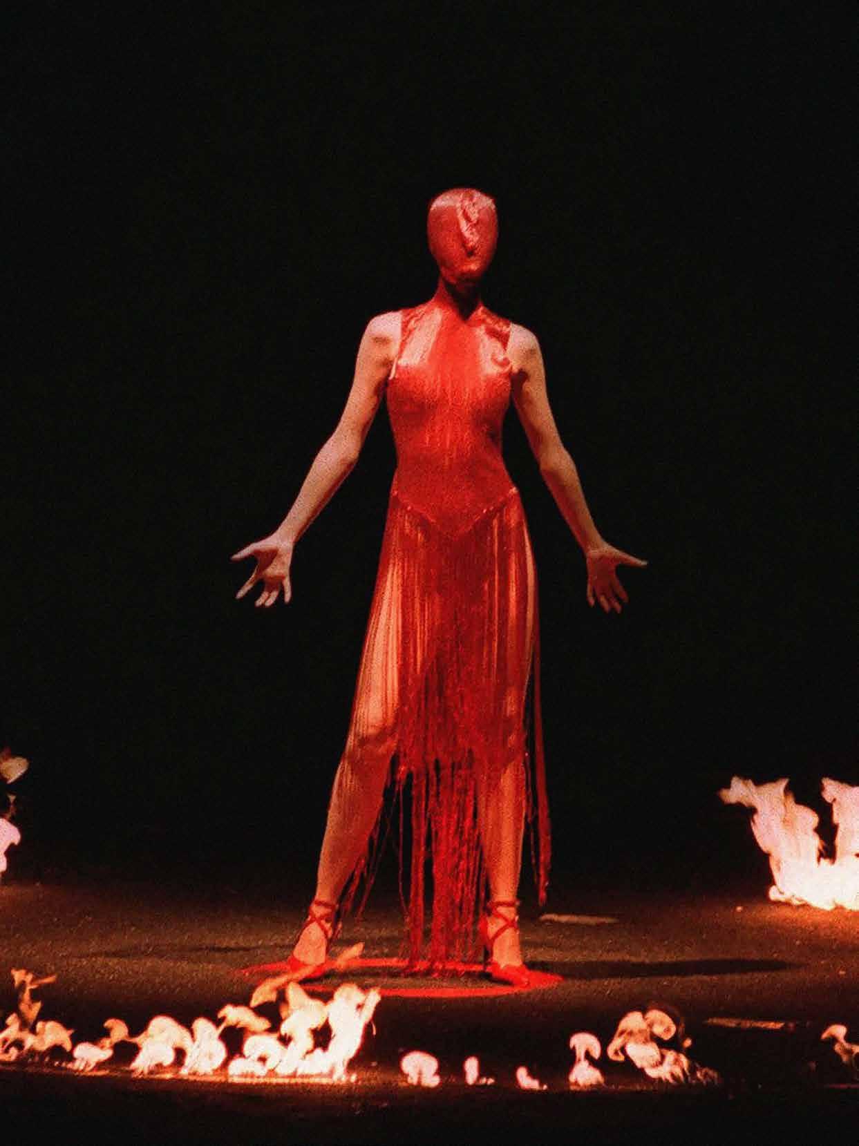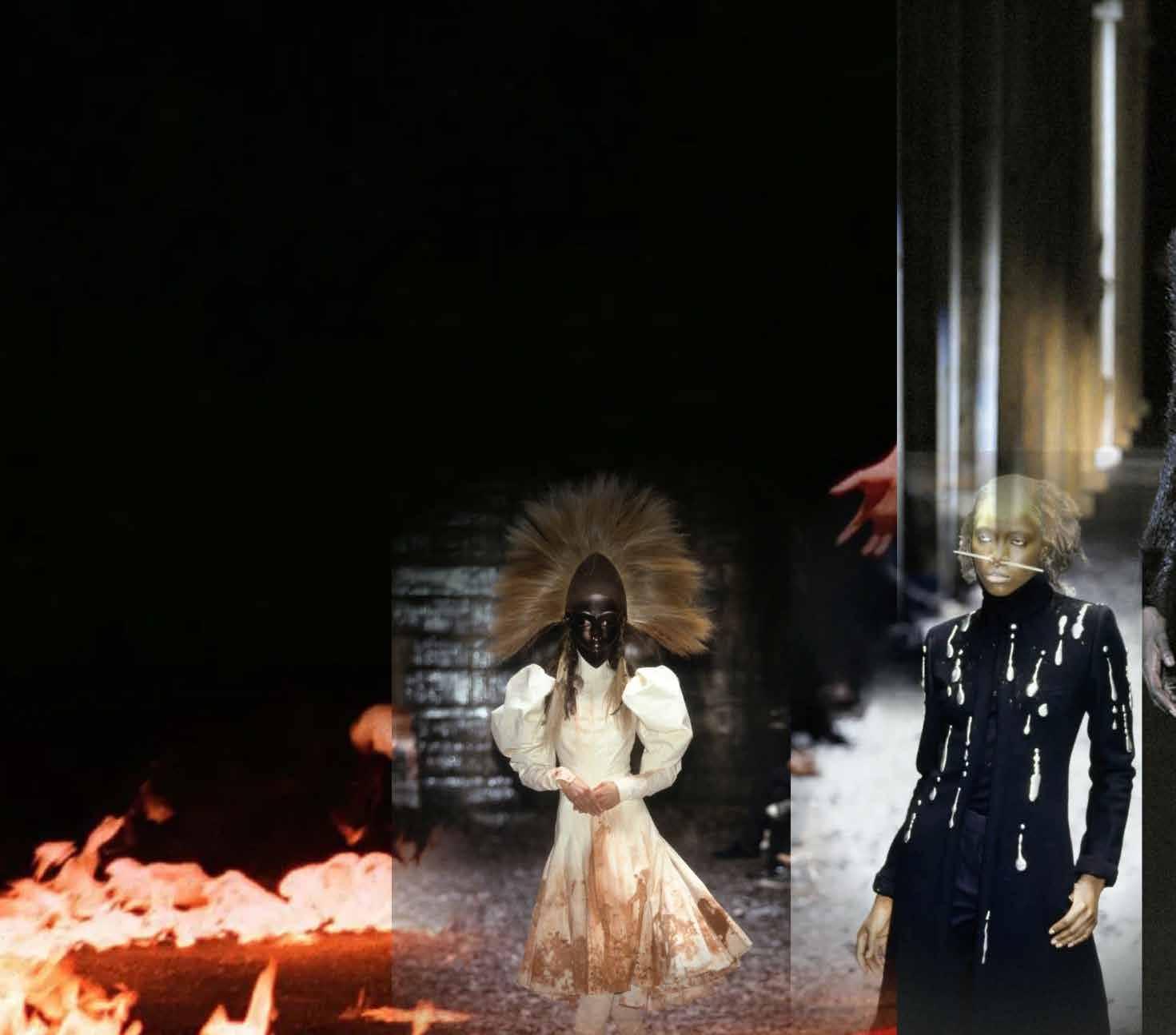 The same symbolisms show up in fashion. Alexander McQueen’s “Joan of Arc” (AW 98) ends in a woman engulfed by flame, silver chainmail glowing like molten skin, not as entertainment but as sacrifice. He understood what the ancients did: that to destroy something beautifully is the highest act of belief. Two years later came “Eshu” (AW 00), McQueen’s tribute to the Yoruba deity who rules crossroads and chaos, the messenger between mortals and gods.