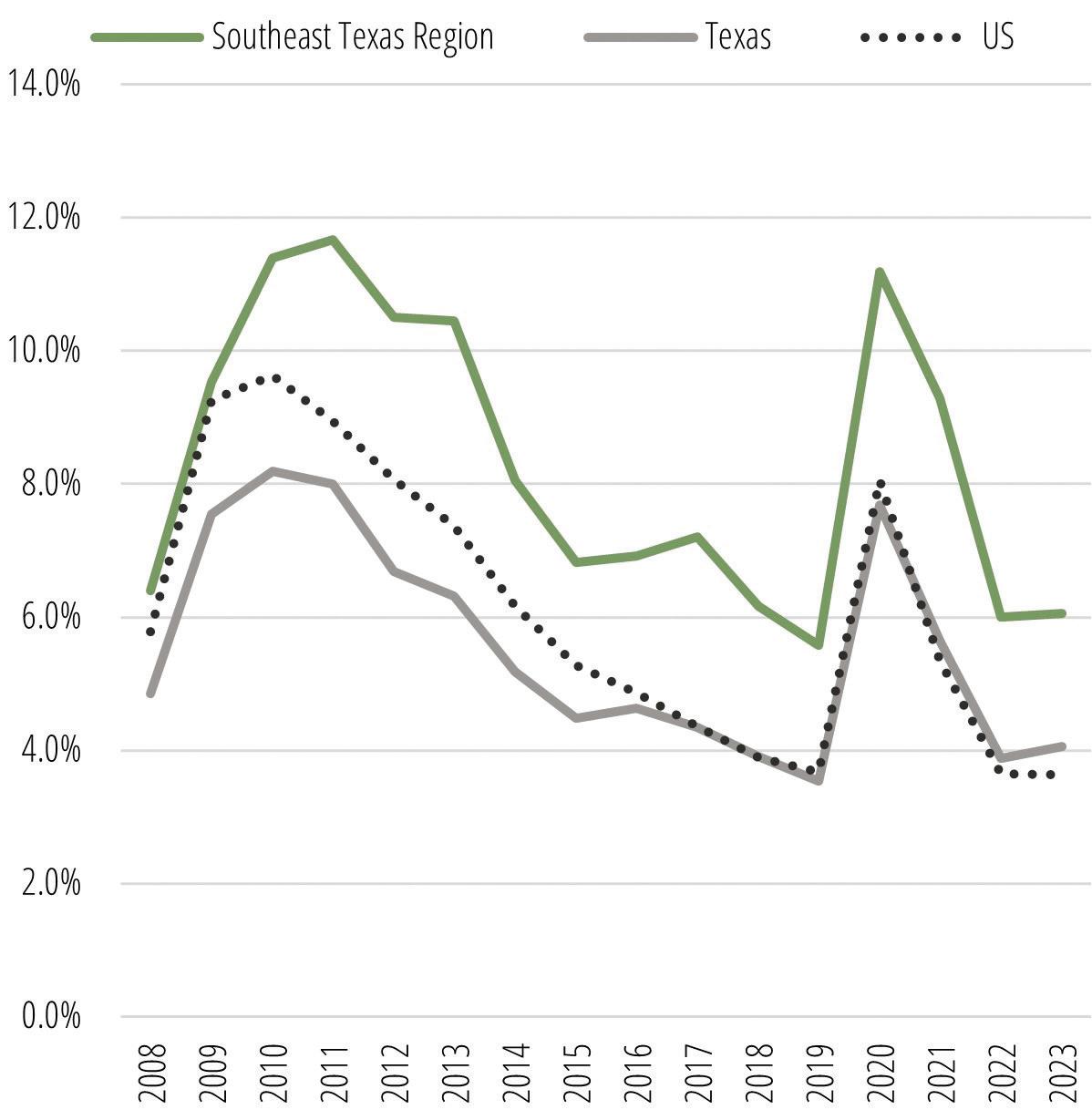 Employment situation. The Southeast Texas region has recovered some of its jobs after it was hard-hit by the pandemic-related downturn. However, it remains three percent below its 2019 level of employment. Between 2019 and 2023, the manufacturing and construction sectors were the hardest hit sectors. In fact, 14 out of the 20 major industry sectors lost jobs during this same period.