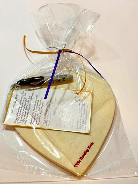 A keepsake of connection,theTraveling Heartisa 7.5” x 7” stoneware heart for signatures, memories,and love shared on its journey.