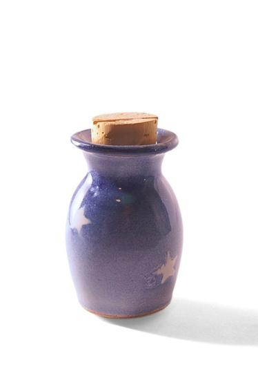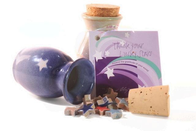 Ceramic jar with cork top in our Stars Motif. Each jar contains 12 small ceramic stars. Appreciation and gratitude are essential to our personal growth and progress towards inner, family, and global peace. Expand the gratitude in your world by expressing it with these twelve stars! Give thanks for a gift in your life as you drop a star in the pot. Use ‘thank your lucky stars’ in your daily practice, at the family dinner table, or to begin or end a meeting.