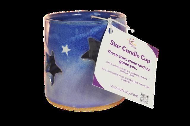 Star Candle Cup - W/O Tag. This handmade stoneware candle cup with a glass votive insert and tealight could be the perfect gift! The tag reads, "These stars shine forth to guide you. Fire connects us to our purpose and our spiritual path. Fire consumes what stands in the way of our purpose " .