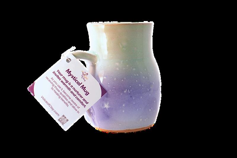 Handmade, stoneware Mystical Mug comes with an attached tag, "Your mug is a nurturer and invites warmth and comfort. As you use it, become aware of receiving those qualities and allow in its healing benefits".
