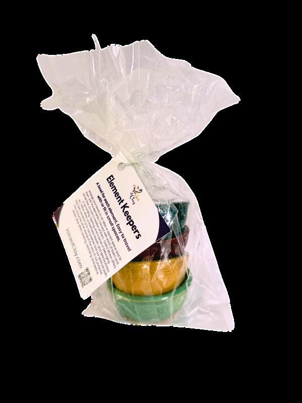 A set of 4 small, stoneware bowls for each element. Easy to travel with or fit in small spaces. The tag reads, "Arrange your bowls on an altar or sacred space and fill them with the elements. Connect with them, and remember you are a creation of them. Earth/Brown offers us grounding, clearing, and a sense of belonging. Air/Yellow offers us freshness, breath, and spaciousness. Fire/Red connects us to our purpose and spiritual path. Water/Blue offers clearing, cleansing, and peace.