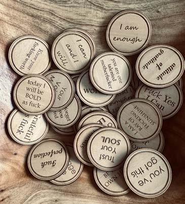 Made from hand finished 1/8” alder wood and laser cut. Comes with 15 affirmation coins in a canvas drawstring bag.