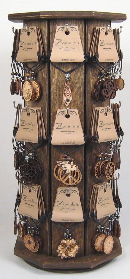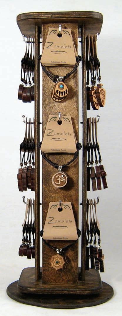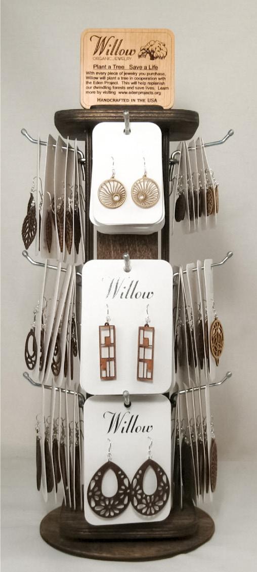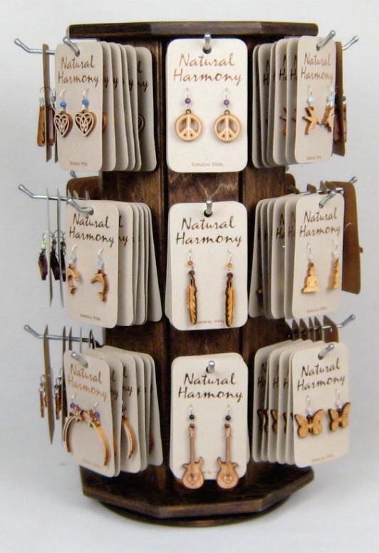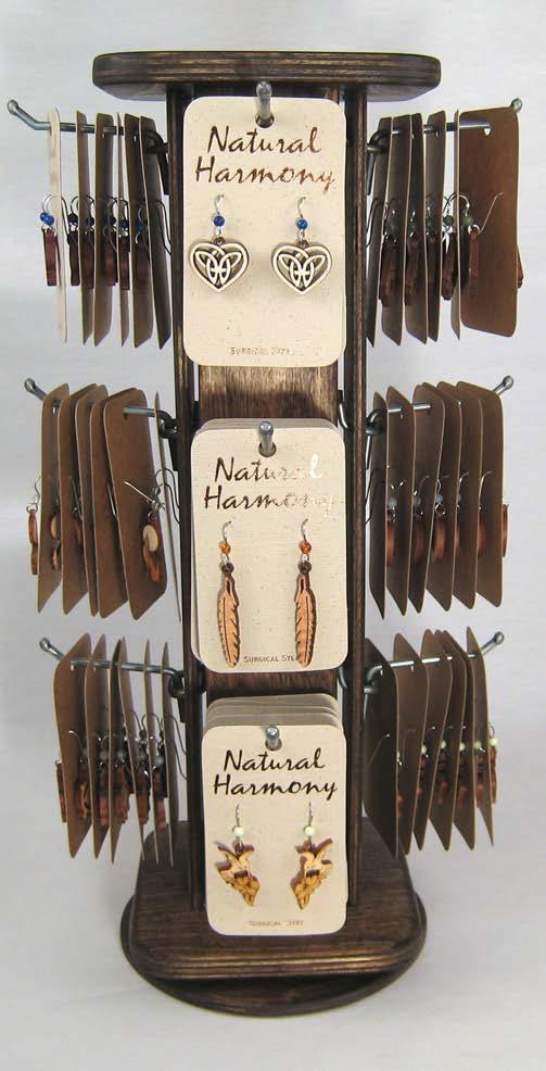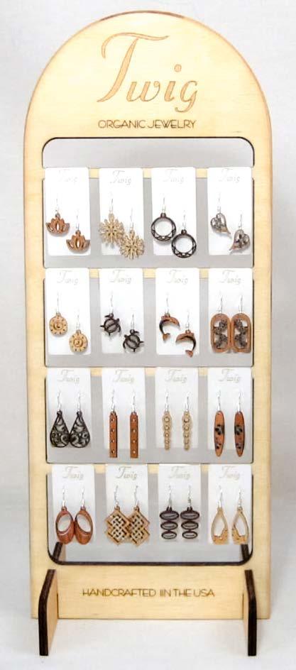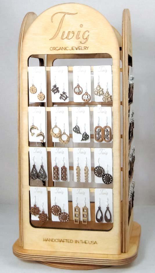 The Twig display is constructed from baltic birch,. The spinner measures 6 5/8” x 6 5/8” x 15 5/8” and holds 64 earrings. The easel display measures 5 7/8” x 5” x 14 3/4” and holds 16 earrings.