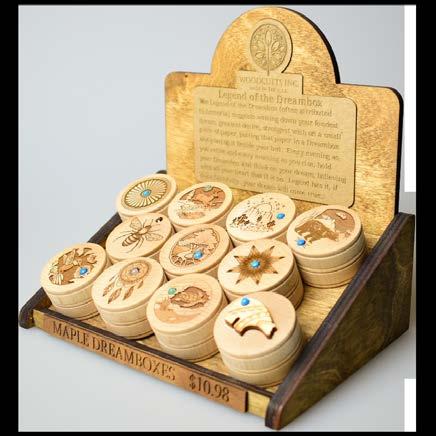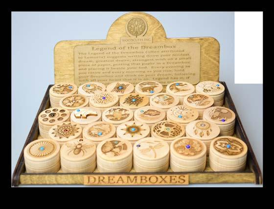 The Dreambox display is constructed from solid alder and baltic birch. It measures 6 3/4" L x 5 1/2 " W and stands 17" tall. Each display holds 11 boxes and included in each box is a “Legend of the Dreambox.”