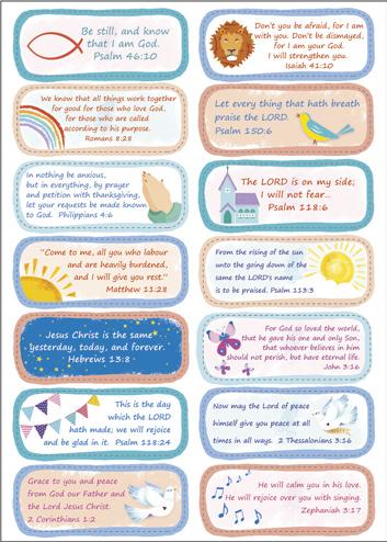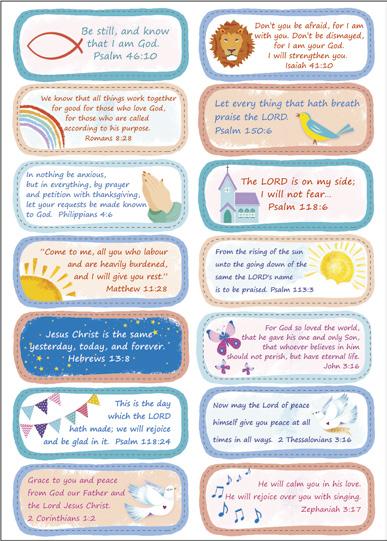 Cheerful imagery and well-loved Bible verses combined in this pack of 5 sheets of 14 designs. Sticker size: 6.5 x 2.5cm.