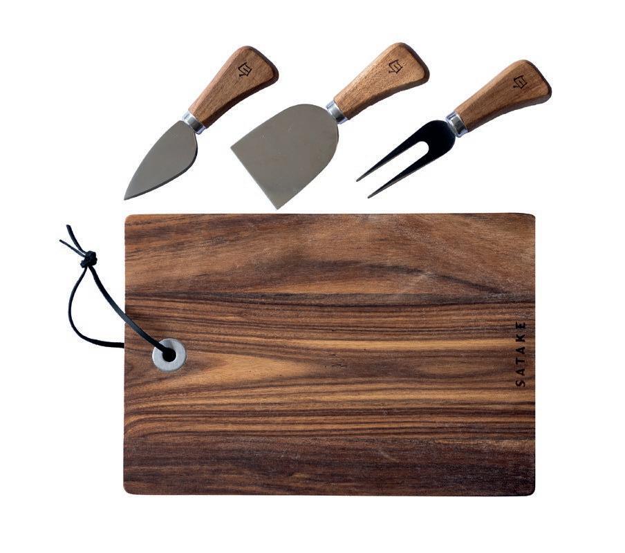 Satake Shiro ostset har en liten läcker skärbräda i akacia som är 17x25 cm med en mockarem för upphängning. Skärbrädan kommer i ett set med tre ost- & charkredskap. En kniv, en spatel och en gaffel i rostfritt stål med snyggt designade skaft av akaciaträ. Bladlängd 7 cm och skaftlängd 7 cm.