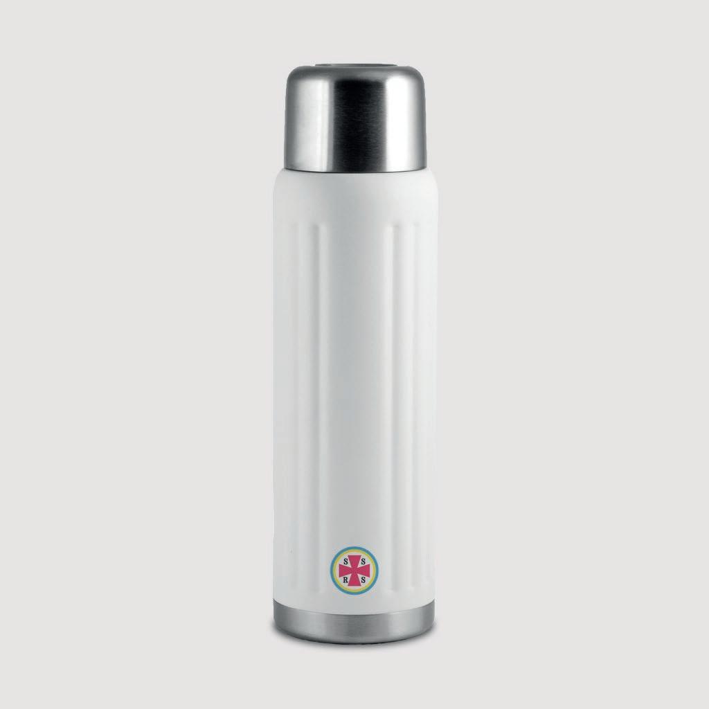 Vit termos med matt yta och Sjöräddningssällskapets bildmärke. Termosens greppvänliga struktur gör den lätt att hålla, både med och utan vantar. Försluten med isolerad skruvkork. Volym: 750ml