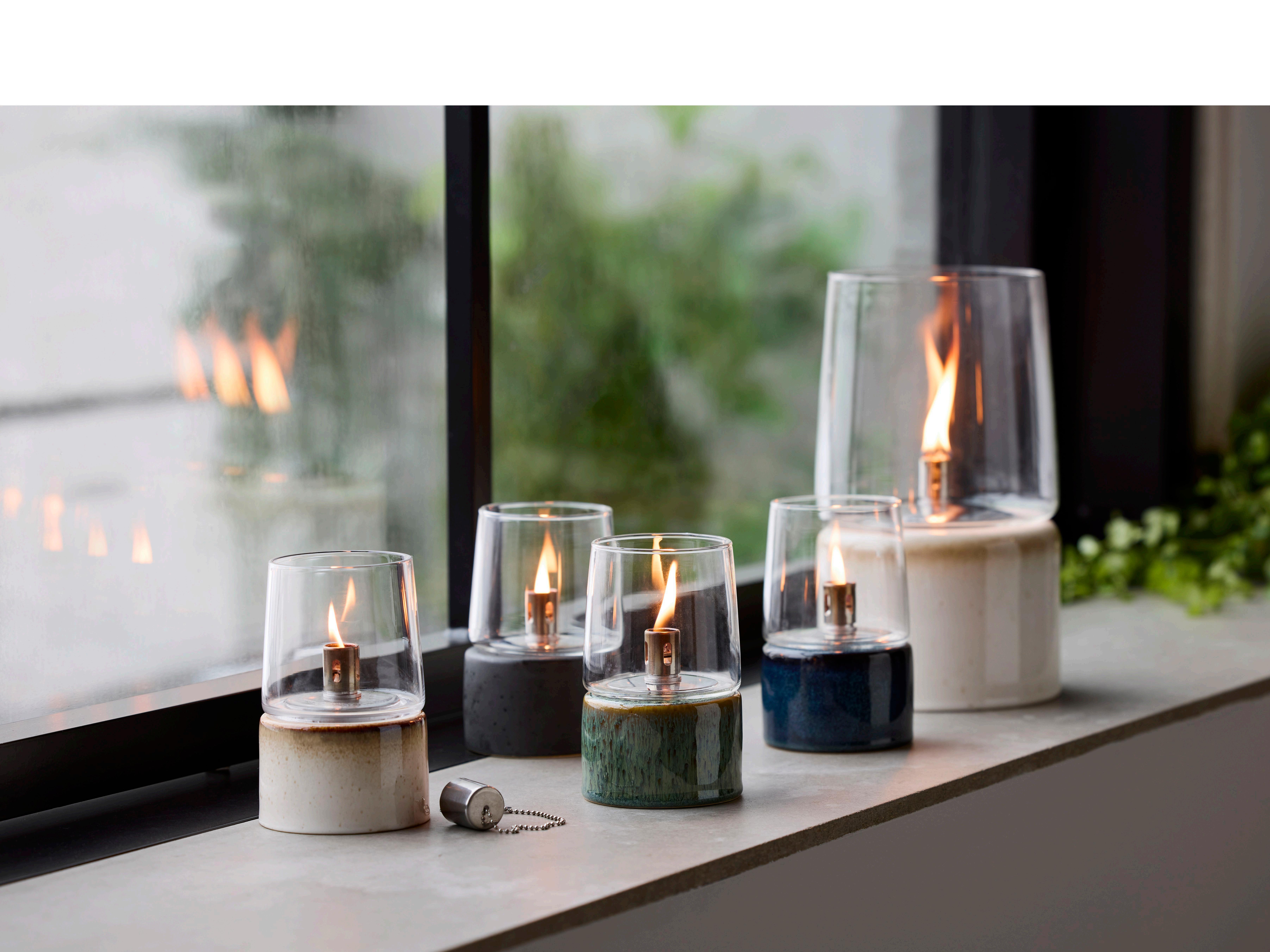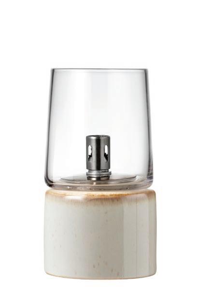 Vad finns det inte att älska med denna mysiga oljelampa i stengods och glas? Placera den på matbordet, fönsterbrädan eller i en mysig vrå. Lampan har en bas av glaserat stengods och en brännare av rostfritt stål med veke. Oljelampan finns i två storlekar och det är så enkelt och självklart att integrera oljelampan i både dukningen och den övriga inredningen. Oljelampan är lämplig för både inomhus-