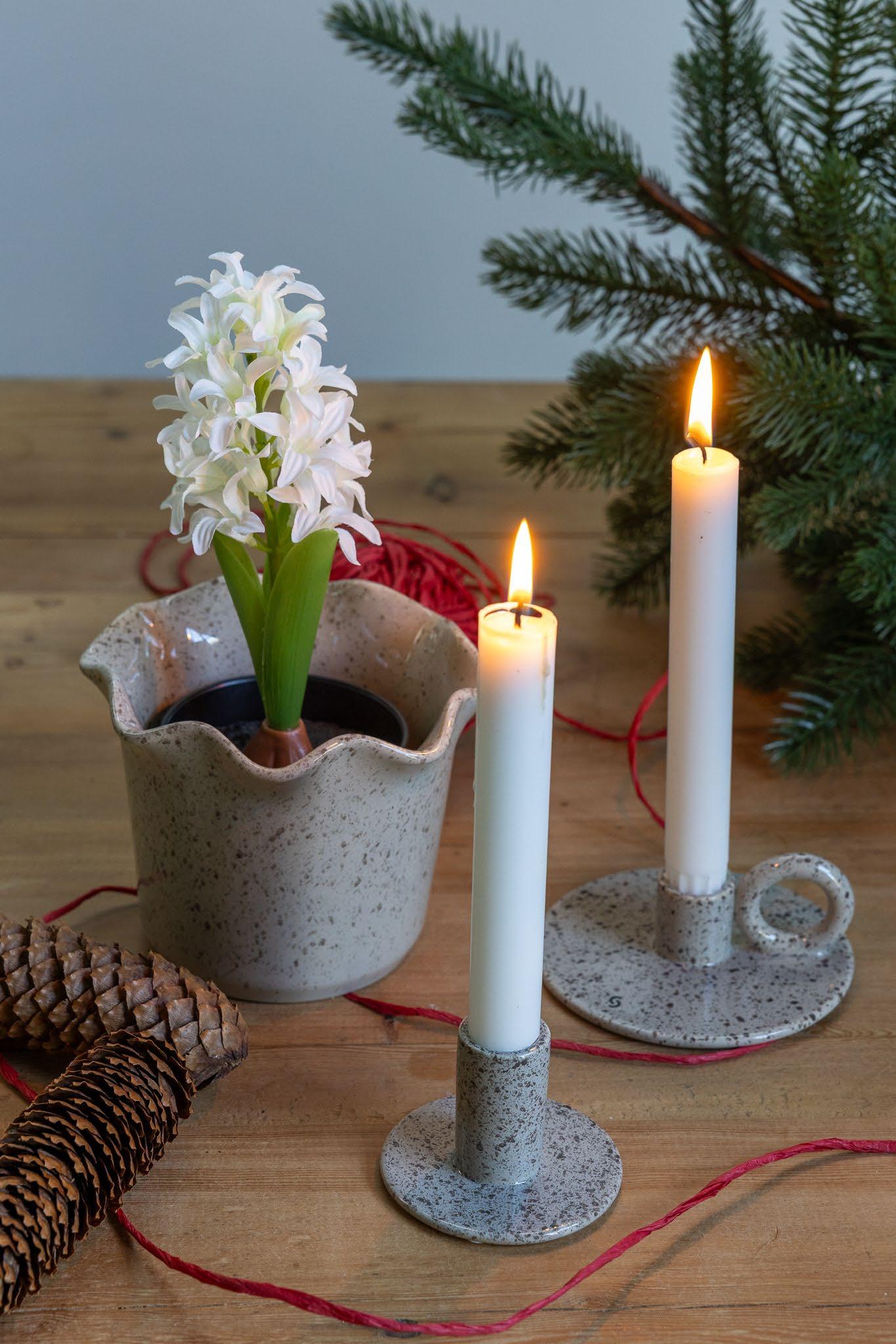Klassiska kammarljusstakar i glaserad keramik som sprider en varm och inbjudande atmosfär, lika fina ensamma som i grupp. Setet kompletteras med en stilren vas i glaserad keramik, perfekt för blommor, kvistar eller som dekorativ detalj året runt. Även fin i sin enkelhet eller med köksredskap i.