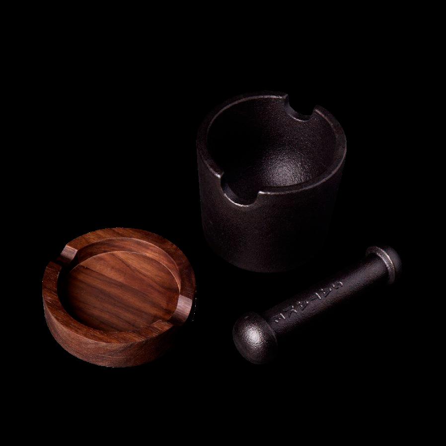 En klassisk mortel i modern tappning, med smarta fördjupningar som fungerar både som viloplats för stöten och praktiska hällpipar. Det vackra valnötslocket kan användas som hållare för stöten eller som serveringsfat.