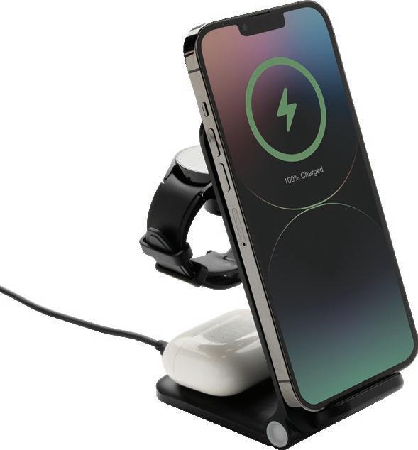 3-i-1 trådlöst laddningsställ tillverkat av RCS-återvunnen ABS.