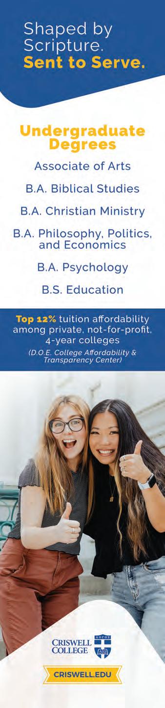 ADDRESS 4010 Gaston Ave., Dallas, TX 75246 WEBSITE Criswell.edu PHONE 214-818-1395 • FACEBOOK CriswellCollege • INSTAGRAM @CriswellCollege TWITTER @CriswellCollege • YOUTUBE Criswell College