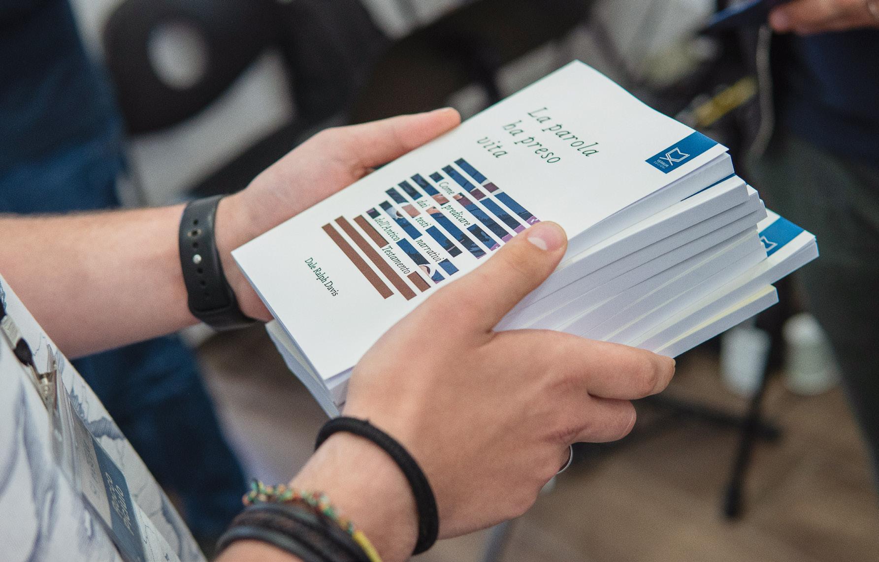 B Man with copies of the Italian translation of The Word Became Fresh by Dale Ralph Davis