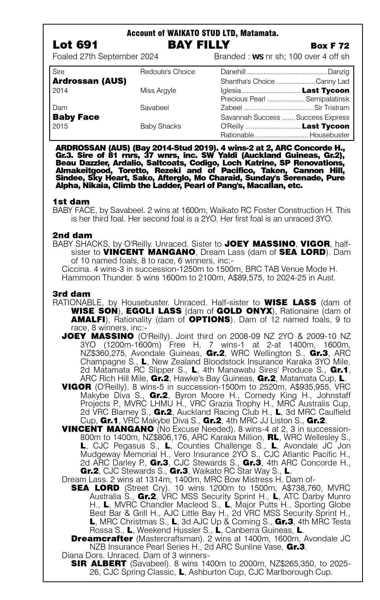 4th - Unnamed (2c, Ardrossan) $100k R2R GJ & MA Old 5th - yearling filly by Ardrossan