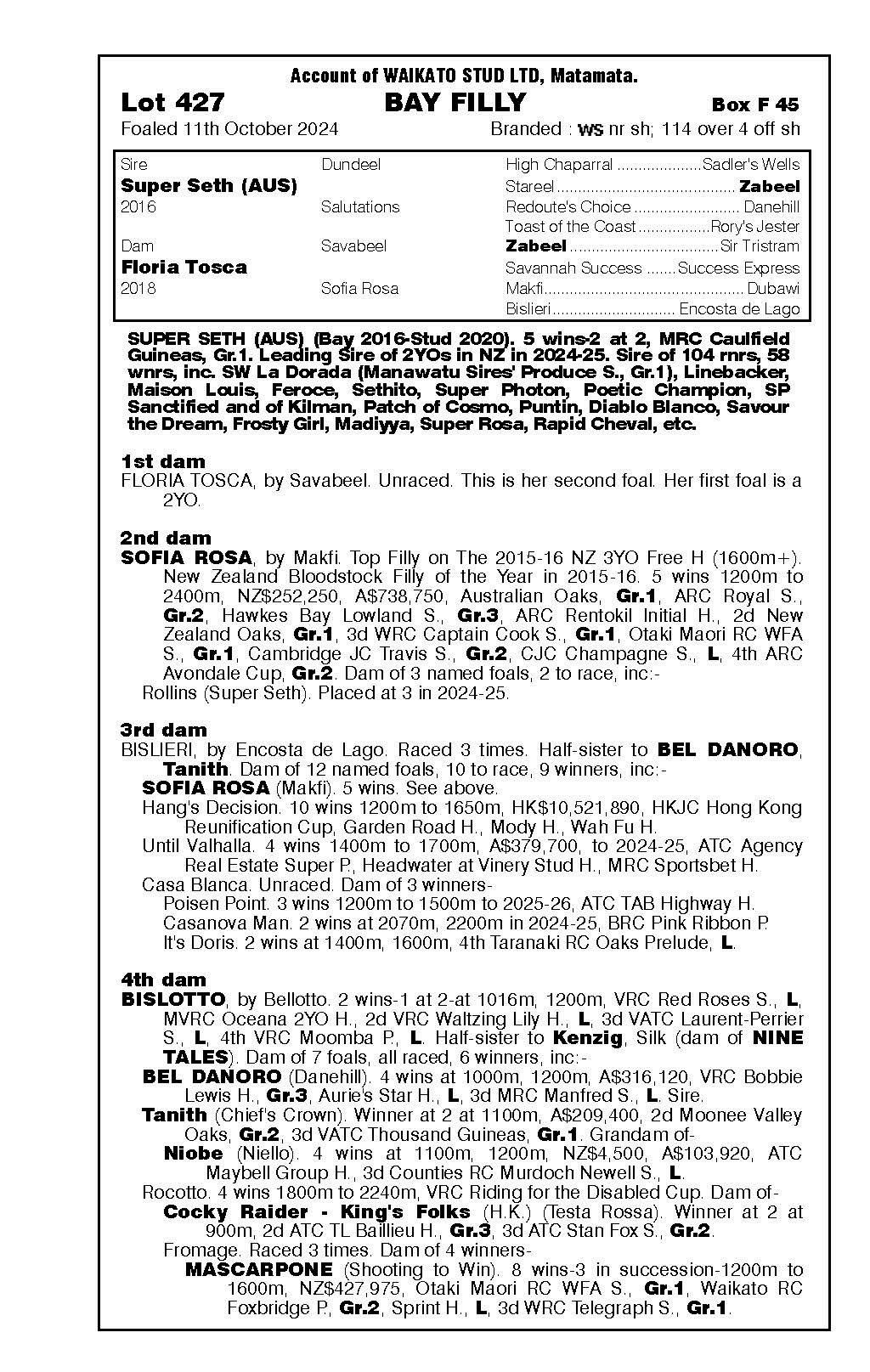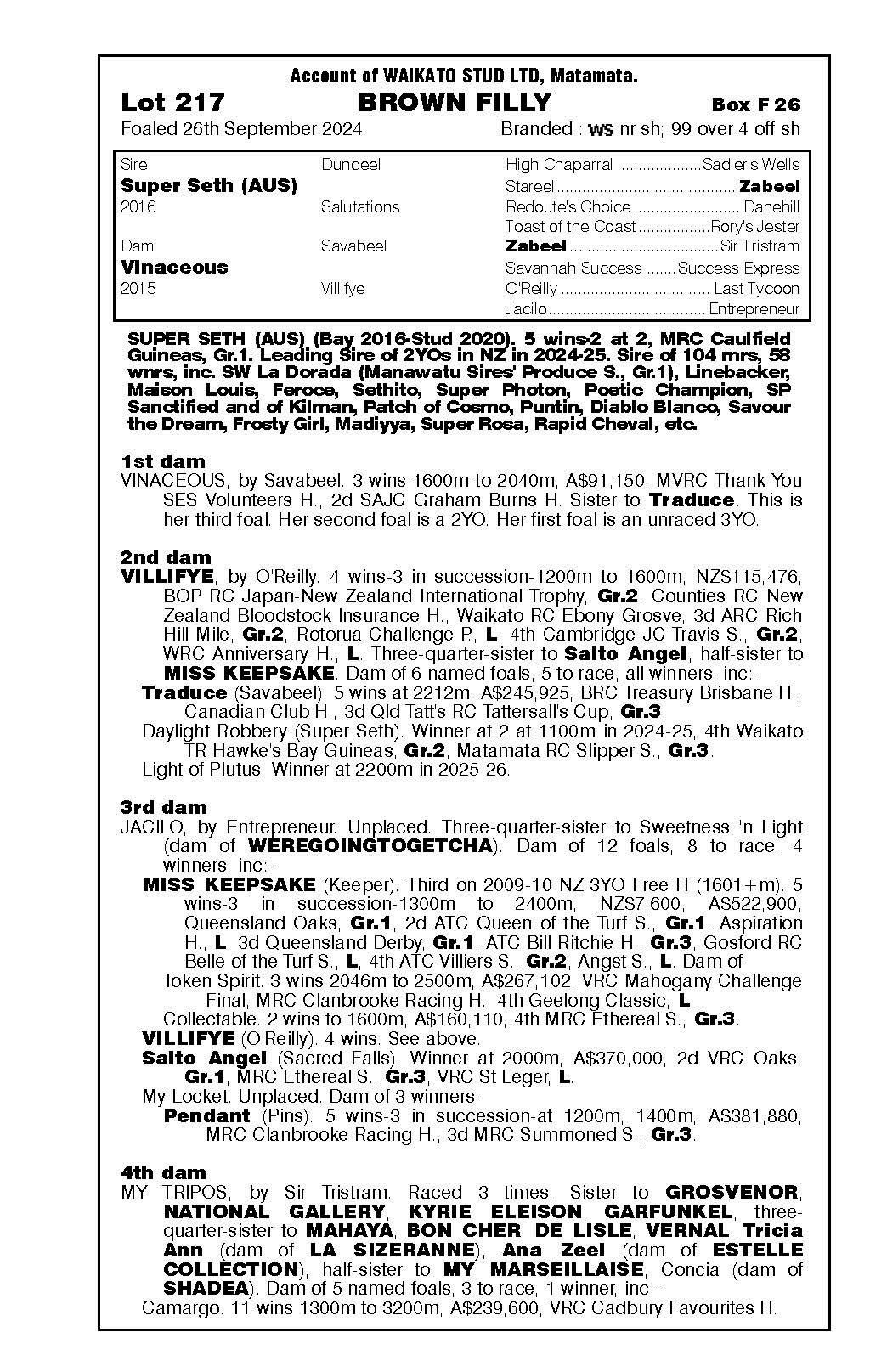 $100k ‘24 NZB to Ohukia, passed in as R2R in ‘24 Trialled once 26 Aug ‘25 7 of 7 th 2nd - Unnamed (2g, Tivaci) WS Own 3rd - yearling colt by Super Seth 4th - filly foal by Ardrossan2025 - covered by Super Seth