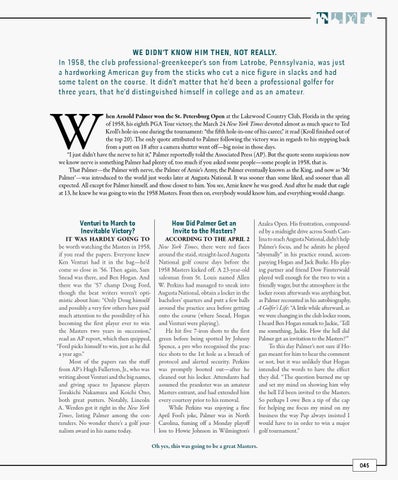 hen arnold Palmer won the st. Petersburg open at the Lakewood Country Club, Florida in the spring of 1958, his eighth PGA Tour victory, the March 24 New York Times devoted almost as much space to Ted Kroll’s hole-in-one during the tournament: “the fifth hole-in-one of his career,” it read (Kroll finished out of the top 20). The only quote attributed to Palmer following the victory was in regards to his stepping back from a putt on 18 after a camera shutter went off—big noise in those days. “I just didn’t have the nerve to hit it,” Palmer reportedly told the Associated Press (AP). But the quote seems suspicious now we know nerve is something Palmer had plenty of, too much if you asked some people—some people in 1958, that is. That Palmer—the Palmer with nerve, the Palmer of Arnie’s Army, the Palmer eventually known as the King, and now as ‘Mr Palmer’—was introduced to the world just weeks later at Augusta National. It was sooner than some liked, and sooner than all expected. All except for Palmer himself, and those closest to him. You see, Arnie knew he was good. And after he made that eagle at 13, he knew he was going to win the 1958 Masters. From then on, everybody would know him, and everything would change.