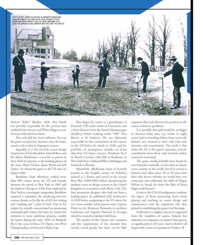 argument that each deserves his position in the course architects’ pantheon. It is possible that golf would be no bigger in America today than, say, cricket or rugby union had its founding fathers from across the Atlantic not warmed to their task with such intensity and commitment. The result is that today the US is the game’s epicentre, and the contribution from those early Scottish settlers cannot be overstated. The game would probably have found its way Stateside eventually, as it has done to almost every country in the world, but if its arrival in America had taken place 10 or 20 years later, then who knows whether we would have ever witnessed, and celebrated, the skills of Hogan, Nelson or Snead, let alone the likes of Jones, Hagen and Sarazen? A visit to the USGA headquarters confirms the legacy of those pioneering Scots—from playing and teaching to course design and maintenance—and the important role they played in establishing the game’s rich heritage. Golf today is a mighty oak, yet it originated from the humblest of acorns. Indeed, few industries or companies can claim to have grown so significantly in 125 years. And to think it all began with a mere cow pasture in Yonkers! ★