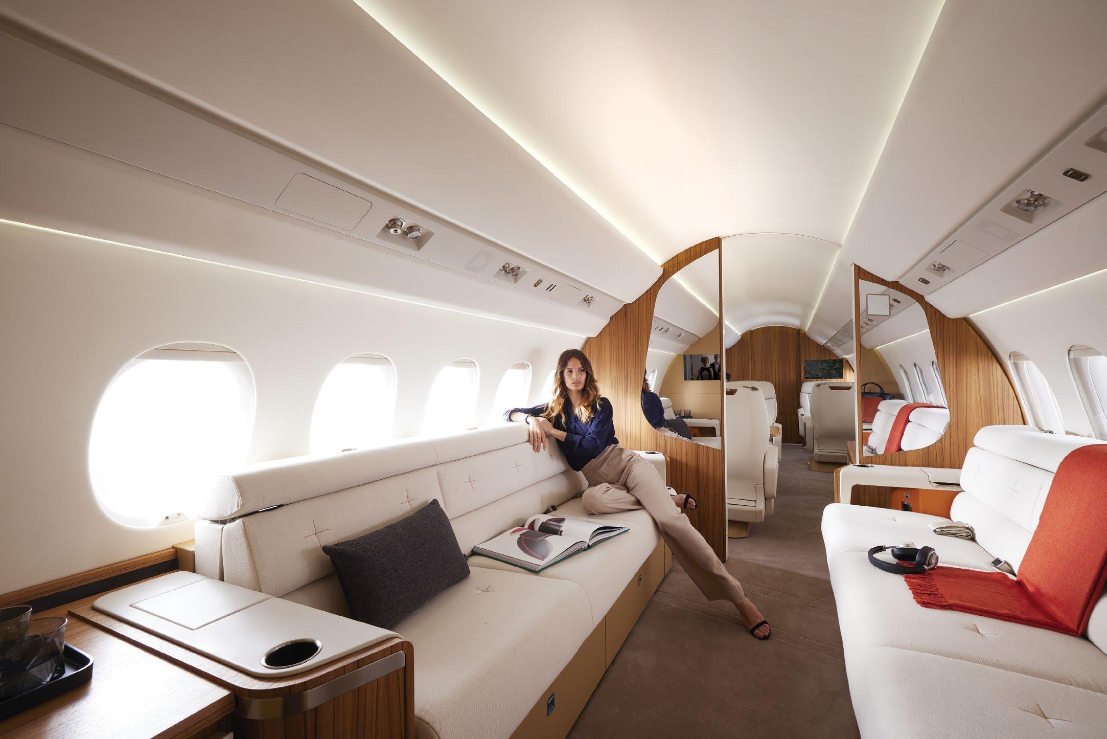 The incomparable Falcon 6X cabin 1.98 m tall, 2.58 m wide. With wide aisles Bright, extra-large windows and skylight. Whisper-quiet cabin. Cutting-edge technology Amazing