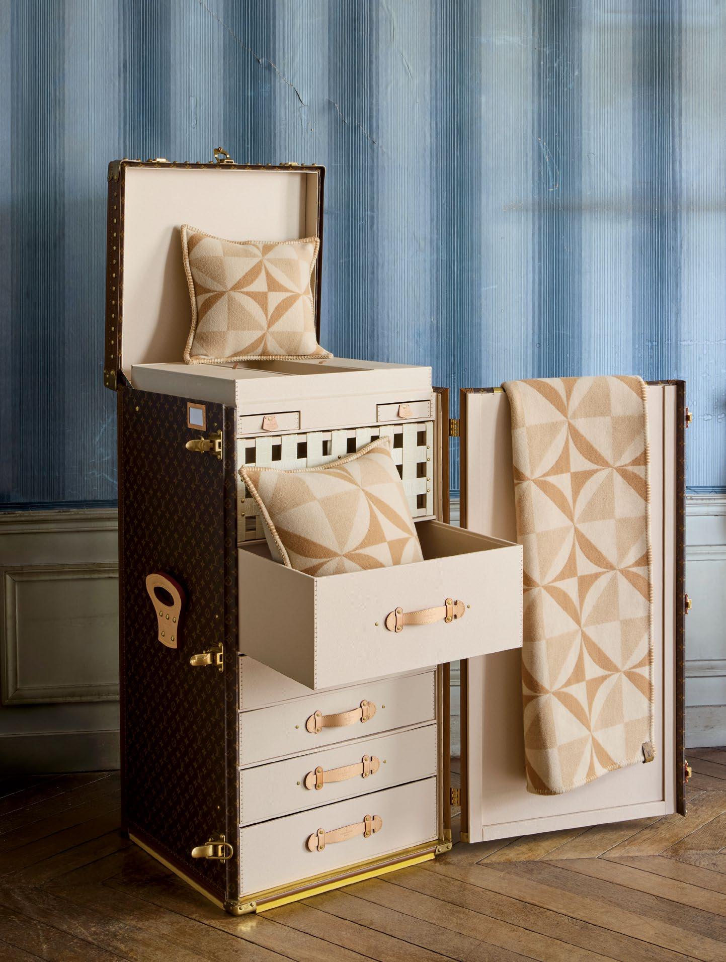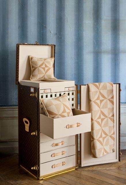 A Louis Vuitton trunk, handcrafted in the Paris suburb of Asnières-surSeine, displays some of the luxury brand’s cashmere items for home.