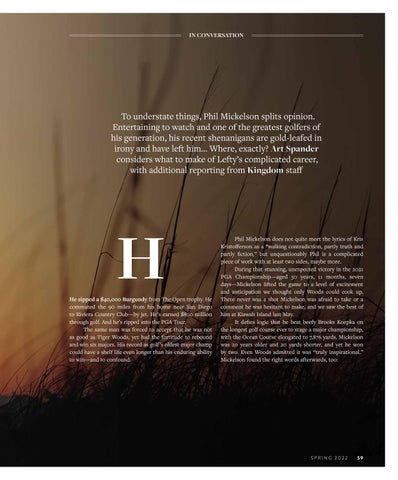Phil Mickelson does not quite meet the lyrics of Kris Kristofferson as a “walking contradiction, partly truth and partly fiction,” but unquestionably Phil is a complicated piece of work with at least two sides, maybe more. During that stunning, unexpected victory in the 2021 PGA Championship—aged 50 years, 11 months, seven days—Mickelson lifted the game to a level of excitement and anticipation we thought only Woods could cook up. There never was a shot Mickelson was afraid to take or a comment he was hesitant to make, and we saw the best of him at Kiawah Island last May. It defies logic that he beat beefy Brooks Koepka on the longest golf course ever to stage a major championship, with the Ocean Course elongated to 7,876 yards. Mickelson was 20 years older and 20 yards shorter, and yet he won by two. Even Woods admitted it was “truly inspirational.” Mickelson found the right words afterwards, too: