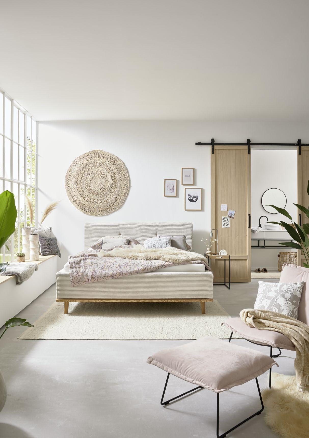 Gestoffeerd bed DELPHI, hoofdeinde 1: met 2-punts stiksel incl. houten poot massief, eikenkleur, houten raamwerk massief, eikenkleur, in stof POSO beige, incl. opbergruimte voor beddengoed en zijdelings opklapbare verende lattenbodem, hoogte hoofdeinde: H 118 cm, ca. B 198, H 118, D 221 cm, ligoppervlak ca. 180 x 200 cm; bijzettafeltje JustB! CT100; tapijt ILVY, kleur white, handgeweven, B 170, L 240 cm, NORDIC DESIGN uit de Musterring-collectie