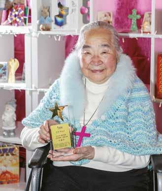 在去年12月舉辦的「中華聖經文物館金色聖誕 音樂分享會」中,影音使團創世電視特別向喬媽小金 子頒贈「創世電視因祢傳奇榮譽大獎」,場面感人。 這個獎項特別表揚看重福音價值,將一生委身宣教傳 福音行動,亦因此上帝令他們生命因而傳奇的人。 喬媽多年來傳承喬宏傳福音的使命,從不言休, 今年是喜樂婆婆二十周年記念,同樣是創世電視二十 周年,因此藉喬媽這次來港,特別先頒贈此極具意義 的獎項給她,盼望藉喬媽的見證,將宣教士的使命傳 承給下一代。 12 享我與喬宏的生命見證,是上帝給我的祝福和醫 治。」喬媽說。 在差不多三年的疫情裏,喬媽的福音使命沒 停止過,只是由實體轉到網上而已;隨着近月防 疫政策放鬆,她又憑信心再度為上帝的國度「出 征」,上帝也特別差派天使照顧她,先有黃凱欣 和她一起「遊船河」傳福音,後有美麗傳奇的弟 兄姊妹在三藩市和紐約的佈道旅程全程照顧她, 另有一位弟兄專為她推輪椅。「我已兩年多沒有 外出服侍主,不知道體力能否應付。但每當我祈 禱問上帝的心意後,祂便派遣天使照顧我,況且 我已年邁,是上帝揀選我給我機會為祂工作,我 怎能Say No?」 喬媽在剛過去的11月順利完成在三藩市和紐 約的福音聚會,12 月則去了香港出席影音使團的 福音活動。上帝賜喬媽莫大的福氣,使年屆90歲 的她擁有連年輕人也自愧不如的魄力。 「其實我也不肯定自己是否90歲。我養母說 我1933年出世,因此我的身份證寫着『1933』, 但後來我重遇親生哥哥和姐姐,一個說我該加一 歲,另一個又說還要加一歲,若是正確的,我該 是92歲。」 那⋯⋯我們應否祝賀喬媽90歲大壽好呢? 「哪用理它!只要開心慶祝就對了!哈哈哈 哈!」喬媽大笑着說,這個喜樂婆婆用大大的笑 容,盡顯活在主裏的人是何等快樂。