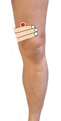 1. 使用四指指腹及手掌上半部(近指端),由 膝上方至腹股溝下緣,拍打大腿的內側,最少 19下,重覆三次。完成後,再拍,正前方、前 外方及外側,共四線。