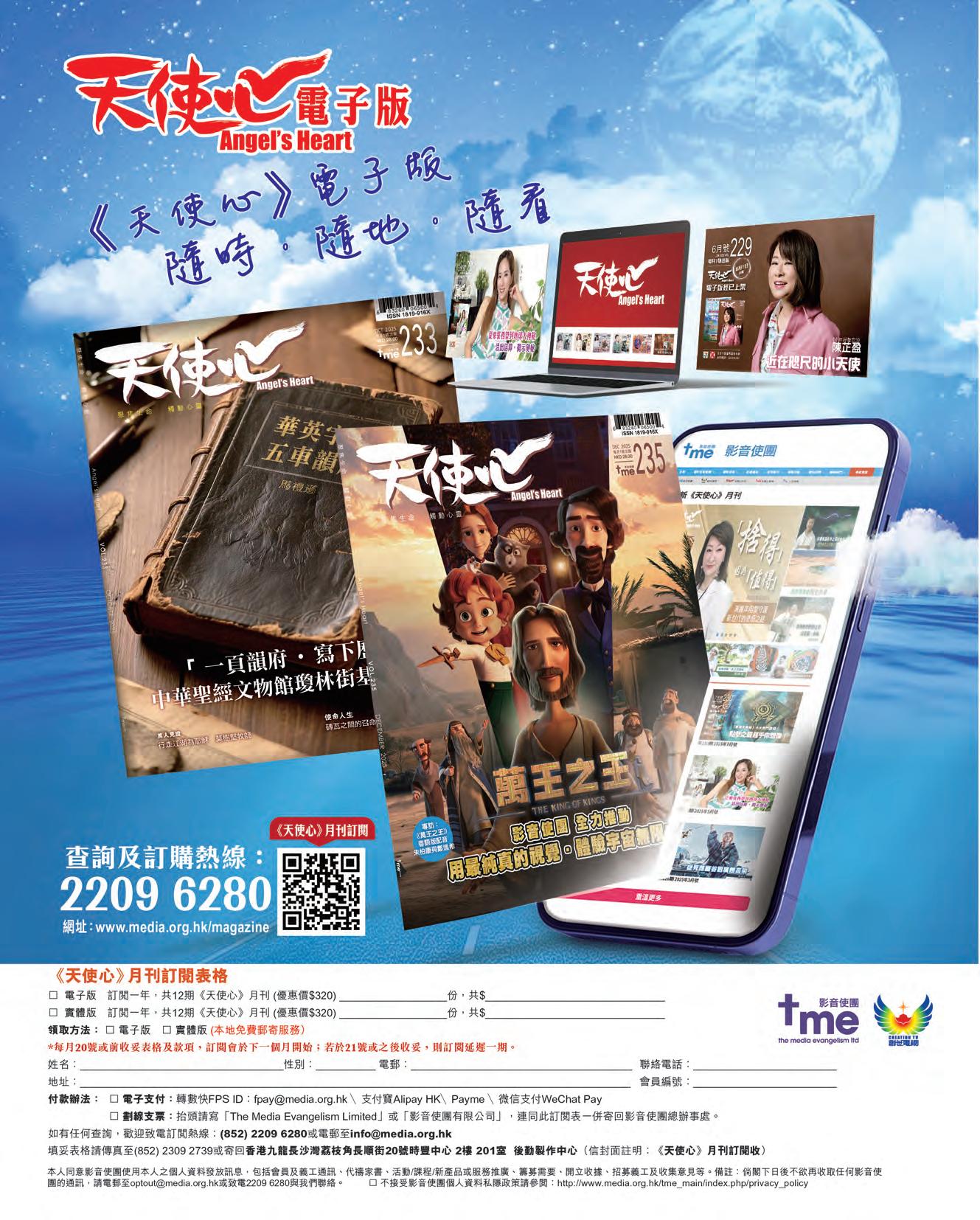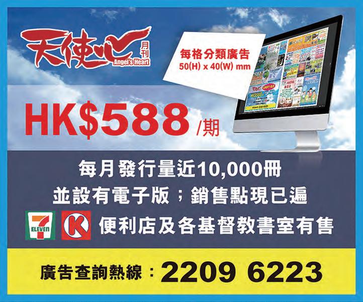本刊文章純屬作者意見,不代表本刊立場。本刊有權拒絕或 修改任何廣告。《天使心》月刊受國際及地區版權法例保障, 未經出版人書面許可,任何圖文不得全部或局部轉載、翻譯 或重印。