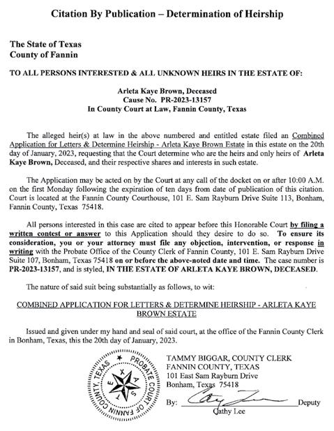Notice of Public Hearings before the Planning & Zoning Commission (City Council as Planning & Zoning Commission) and the City Council: Notice is hereby given that the City of Dodd City, Texas Planning and Zoning Commission will hold a Public Hearing starting at 7:00 p.m. on Thursday, February 16, 2023, in the City Hall/Community Center, 304 South Caney, Dodd City, Texas 75438; and FURTHER, the City Council will hold a Public Hearing starting at 7:30 p.m., on Thursday, February 16, 2023, in the City Hall/Community Center, 304 South Caney, Dodd City, Texas 75438. At such times, the Commission and the City Council will receive input, consider, and potentially act on the Zoning Change Request from Owners, Brian Lackey, Thomas Lackey & T.W.L. Construction, LLC, Trustee, to rezone the following Tracts of Land from: R-1, Single Family Residential District; To: R-2, Multifamily Residential District: Generally, being 0.264± acres in the Lewis P. Cook Survey Abstract No. 241, City of Dodd City, Fannin County, Texas also known as Lots 7 through 10, Block 15, of the Original Town Plat (replated to Lots 9R & 10R); bound on the North by 4th and 5th St. Alley; South by 4th St.; East by White Oak St.; & West by Piney St. All citizens are invited, but not required, to participate in these Public Hearings. The Zoning Request, from Owners, Brian Lackey, Thomas Lackey & T.W.L. Construction, LLC, Trustee of Lots 7 through 10, Block 15 of the Original Town Plat (replated to Lots 9R & 10R), is available upon request at City Hall. Karen Whitfield, City Secretary, 903.583.7710.