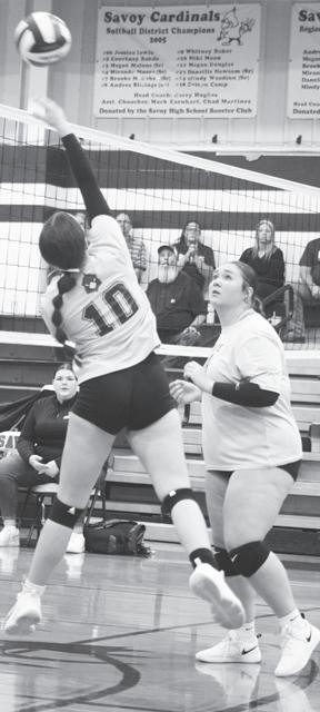 Savoy's Cassidy Almy (10) hits at the net as teammate Presley Walker watches on Sept. 10 during nondistrict volleyball at Savoy.